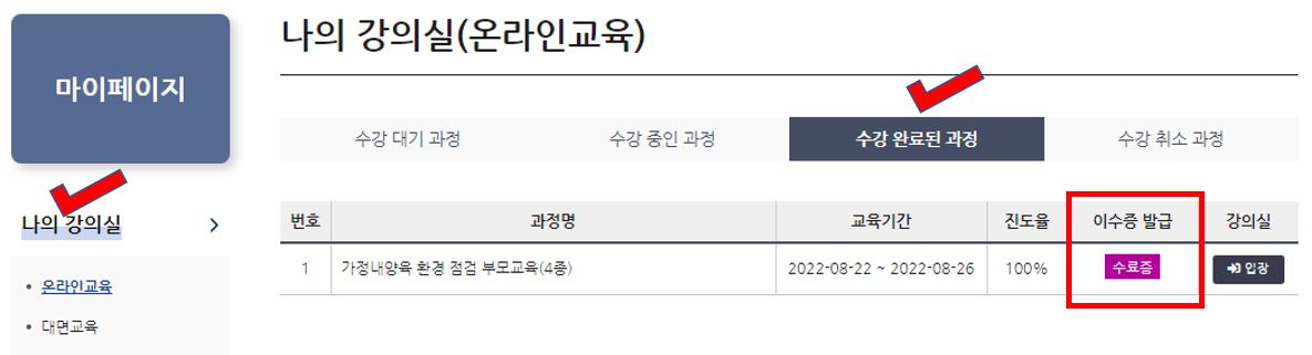 온라인 교육 마이페이지> 나의강의실> 온라인교육>수강 완료된 과정> 수료증 인쇄