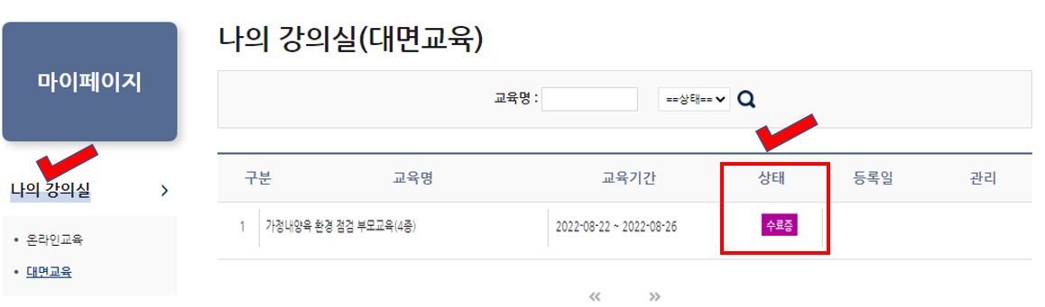 대 면 교육 마이페이지> 나의강의실 >대면교육 >수료증 인쇄